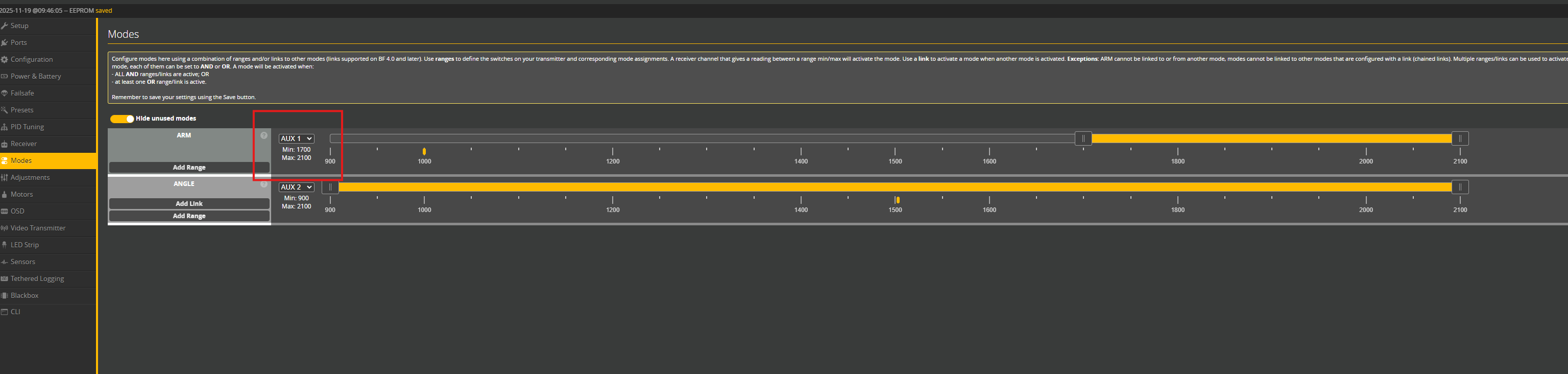 Standardmäßig wird AUX1 bei TBS Crossfire und ExpressLRS für den Arming-Switch genutzt – und das ist auch empfohlen.