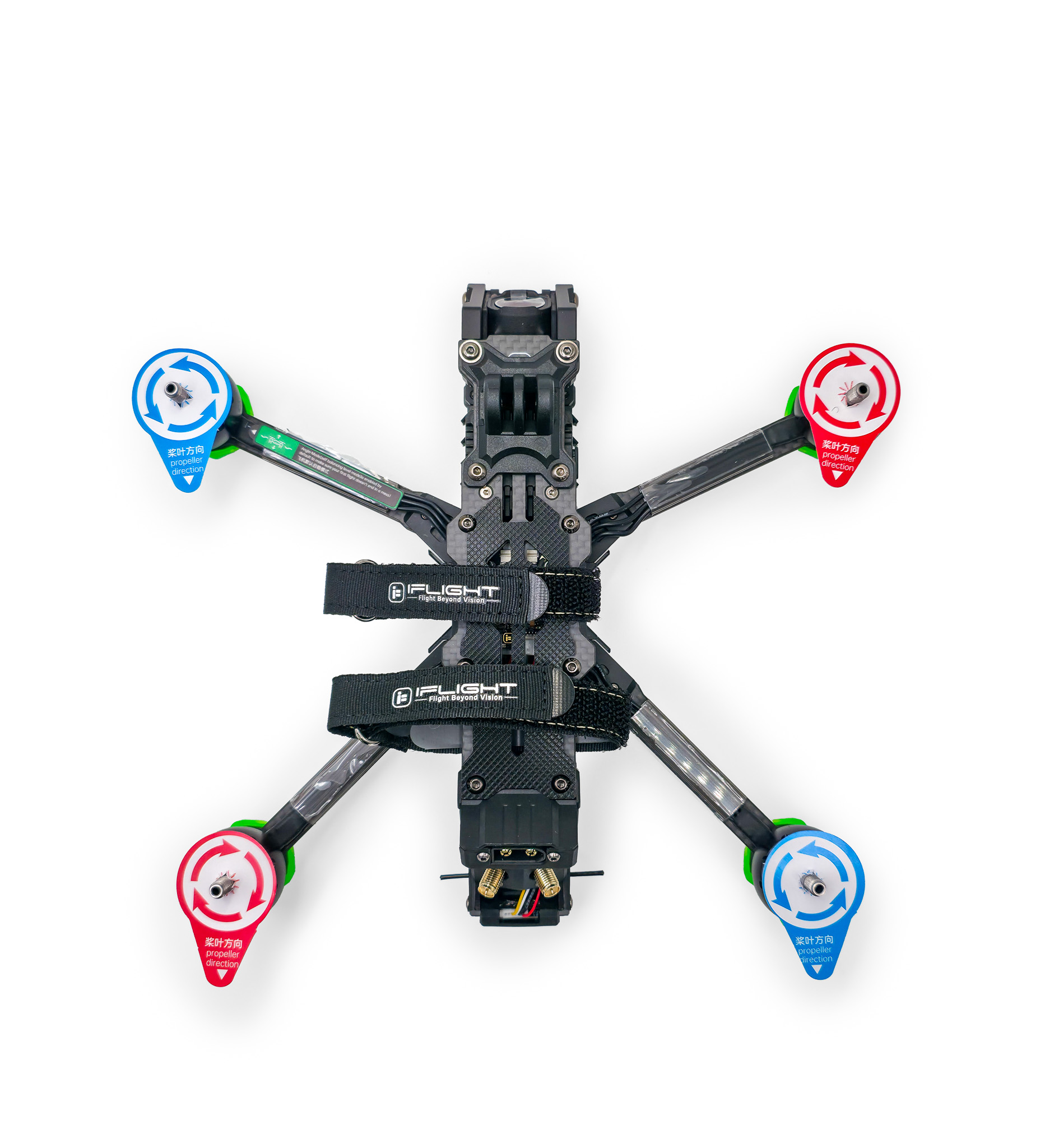 All BNFs from iFlight are shipped in the Props-Out Configuration by default and come with the propeller direction indicators installed, as seen in this picture.
